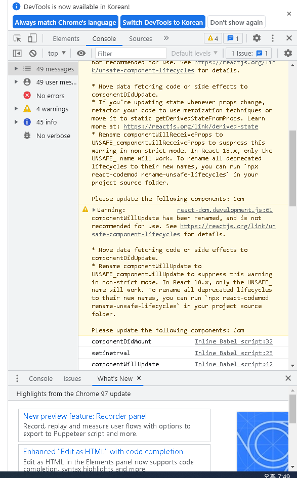 (실행되면 함수이름이 찍히도록 설정을 해놨다. props변경은 없어서 뜨지 않을것이도 unmount도 없을것이다.)