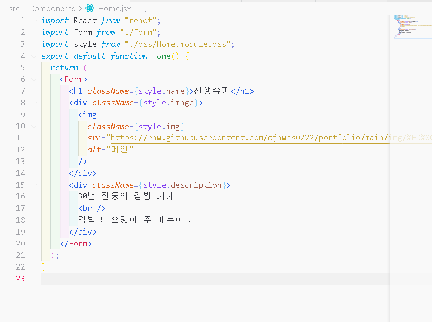 우선 어제 만든 Components 폴더에 Home.jsx 만들고(보여지는 부분)