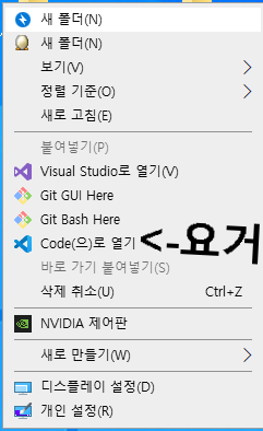 우선 바탕화면 빈곳에서 우클릭 code(으)로 열기 클릭