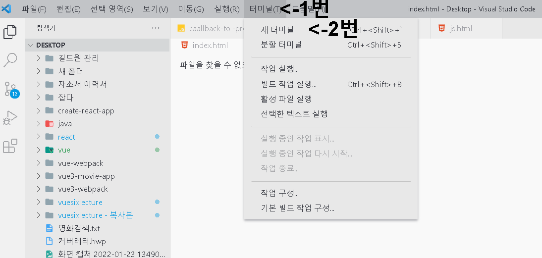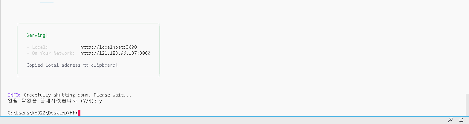 우선 터미널에서 ctrl+c누르고 일괄 작업을 끝내시겠습니까 (Y/N)? 이게뜨면 y를 치고 엔터를 누르자