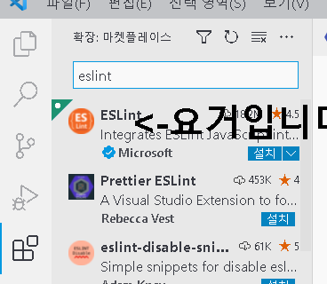 그리고 eslint 검색하고 젤위에꺼선택 하고 설치