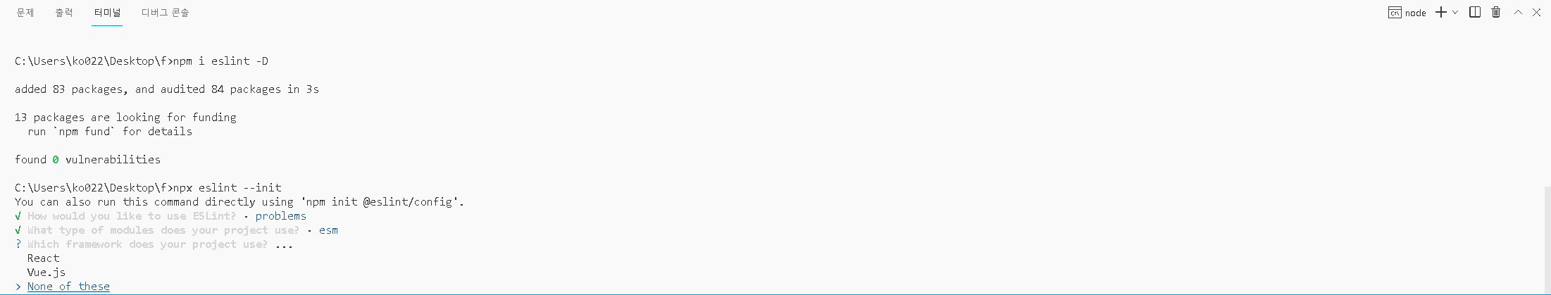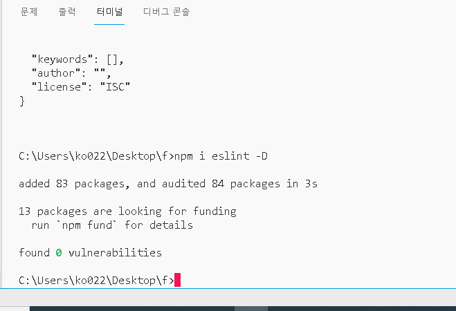 npm i eslint -D치고 엔터