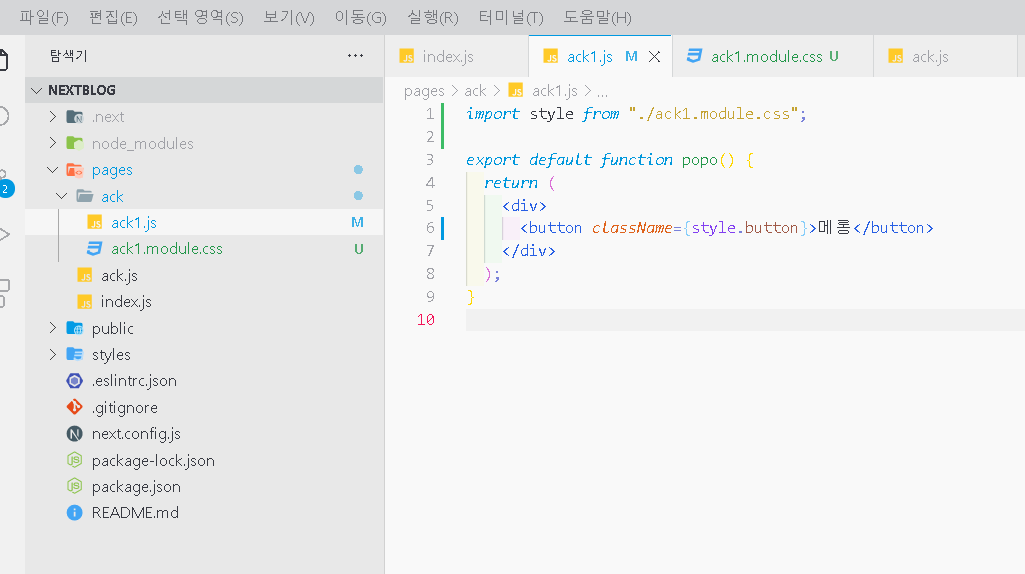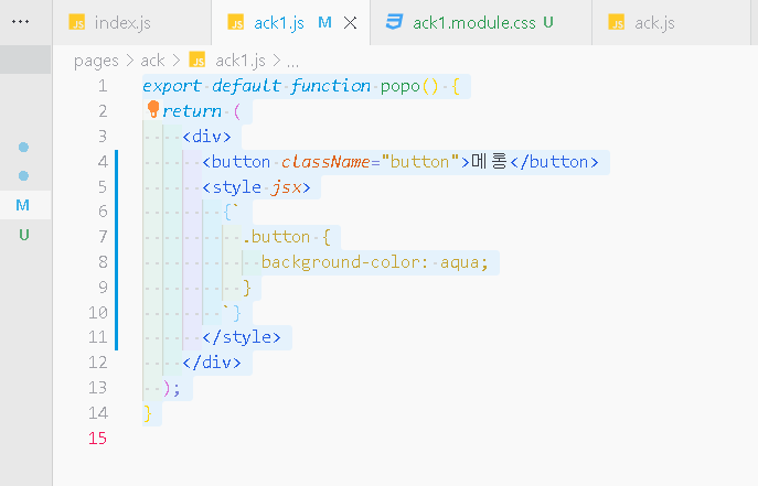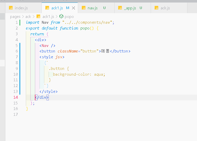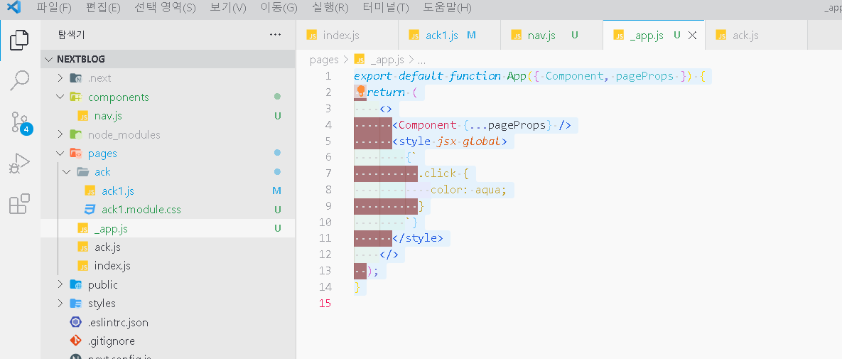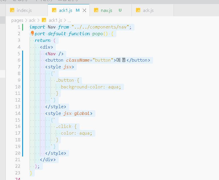그리고 jsx global을 작성해주소 ack1.js에는 global을 지워주겠습니다.