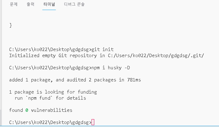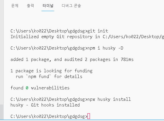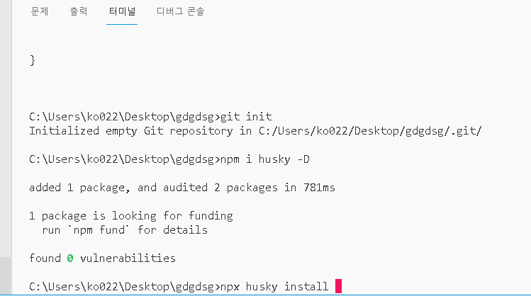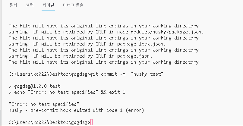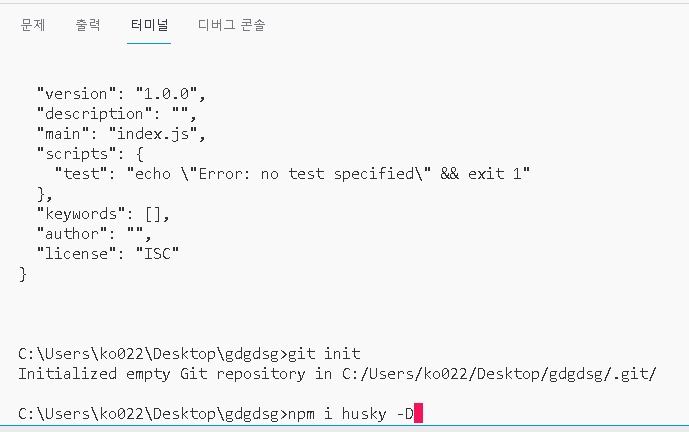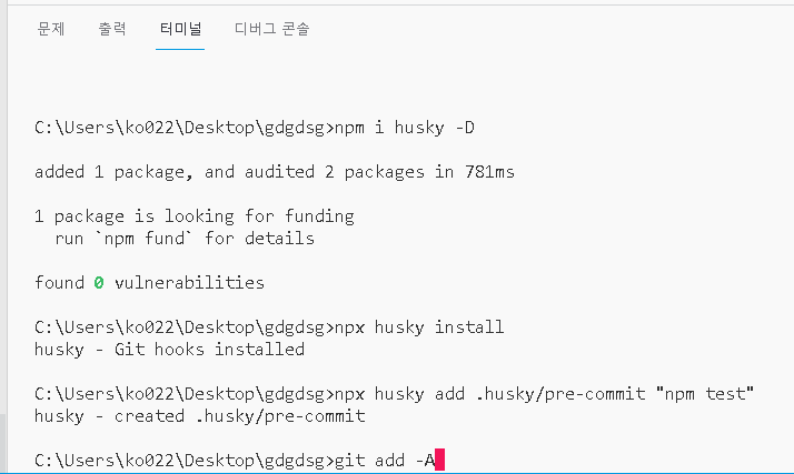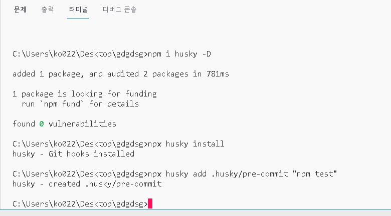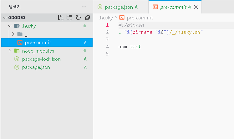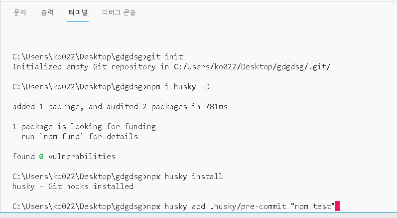 npx husky add .husky/pre-commit "npm test" 치고 엔터(커밋하기전에 테스트 하라는 설정이다)
