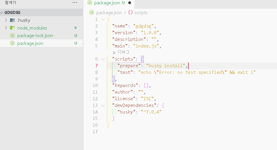 package.json 에 script 내부에 "prepare": "husky install", 추가 하고 저장