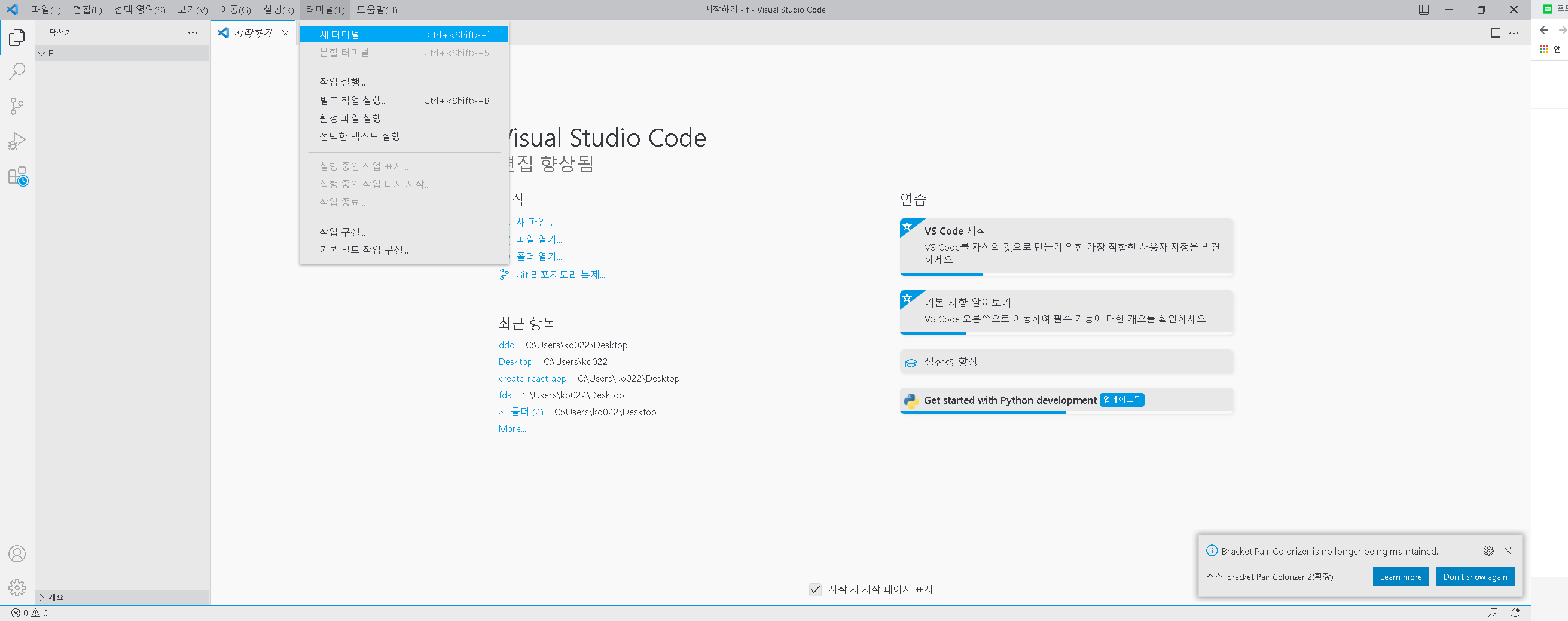 들어와서 터미널 -새터미널 해서 터미널 열어주세요(이때까지 햇으니 알수 있을거에요 ㅎㅎ)