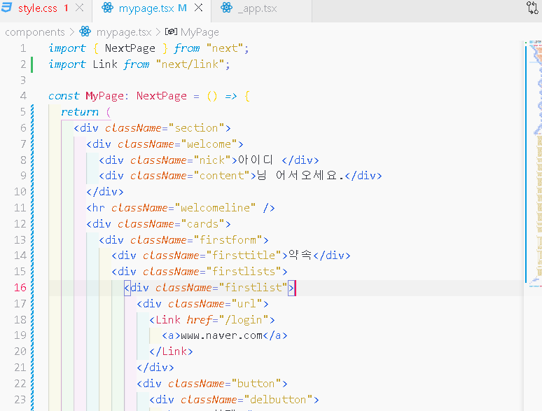 mypage는 특별한거 없고 css에서 after을쓰니까 다음에 드가는게 아니라 해당 요소 내부에서 가장 아래에 들어가더라고요 그요소에 display flex 를 해버려서 위치 조절이 잘안되서 그냥 <hr>을 사용해서 줄을 만들었습니다.