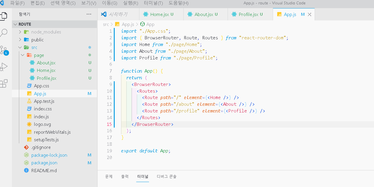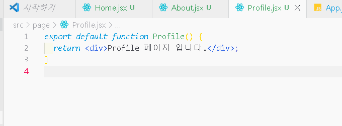 만들었던 폴더에서 vscode창을 열어주자 그다음 src/App.js로 들어가자