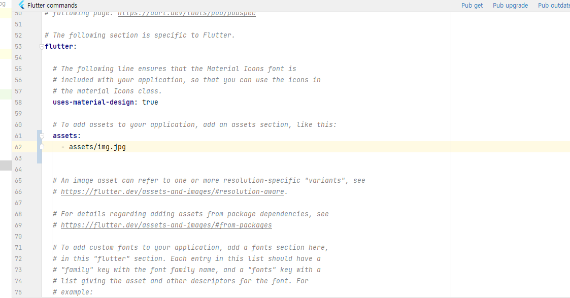 이런식으로 assets:밑에 - 경로 이렇게 넣어주면 그 이미지를 꺼내서 출력할수 있습니다. 여기서는 뛰워쓰기가 예민하므로 꼭 맞춰서작성해주세요 저는 assets파일 만들고 그아네 img.jpg로 이미지 넣어줬습니다. jpg png 상관없습니다.