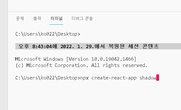우선 바탕화면에 vscode 열고 npx create-react-app 폴더이름 해서 엔터치고 그폴더로 드가서 새터미널 열어보자
