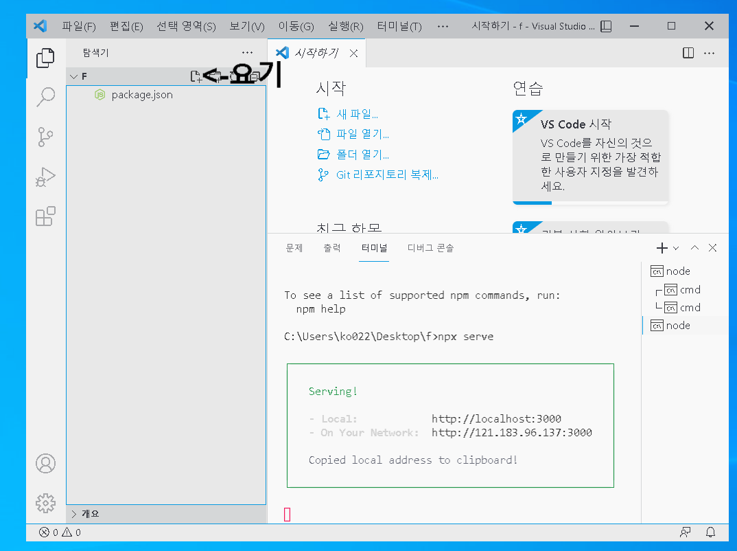 거기다가 npm init -y 입력 엔터->다음에 npx serve 입력하고 엔터->