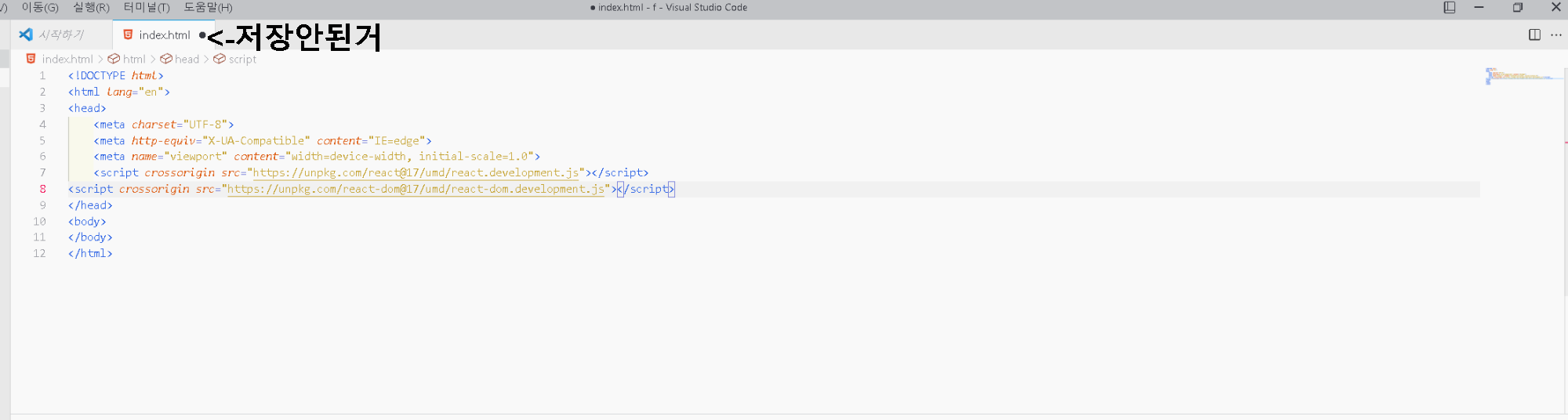 ->https://ko.reactjs.org/이동->우측위 돋보기에서 cdn검색 ->젤위에꺼 클릭 ->젝위에꺼 두줄 복사 해서 헤드안에에 붙여넣기->바디에 20번에 적어놓은거 붙여넣기