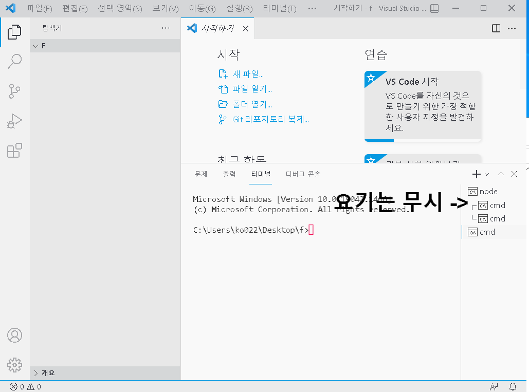 아무폴더만들고->우클릭해서 code로열기클릭->상단에 터미널 눌르기->새터미널 클릭->