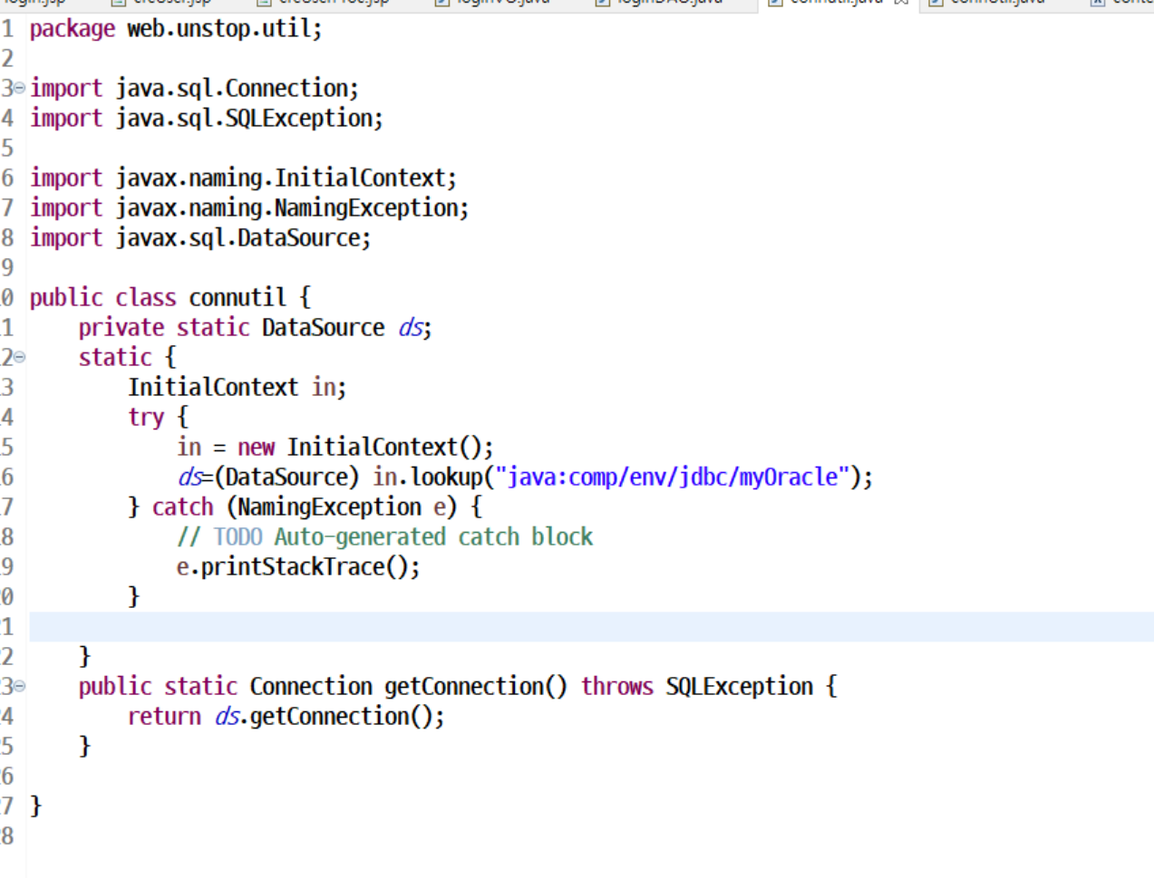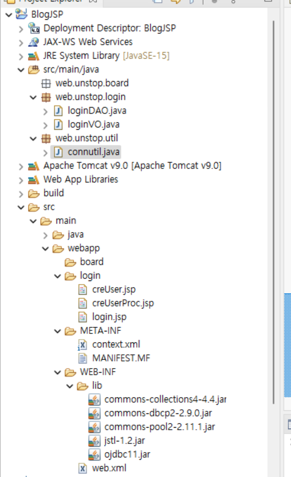 Connection풀을 사용해서 매번 새로만드는 것이아니라 만들어놓고 자동으로 관리해주는 것을 함수로 만들어서 편리하게 했습니다. lib에서 넣은 commons붙은것은 이것을 위해 넣은 것입니다. ojdbc는 데이터베이스 연동을 위해 넣은것이고 어떻게 보면 이것을 위한것이라고 할수 있습니다.jstl은 쓸지 안쓸지 몰라서 일단 넣어놨습니다.