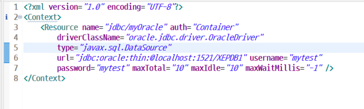 context.xml입니다. 이름으로 여기를 web.xml에서 찾아오고 auth와 type을 참고하여 찾아오게 됩니다.그리고 나머지는 찾와서 활용하게되는 데이터들입니다. 즉 여기는 우리가 connection을 만드는 데 필요한 자원 즉 데이터가 저장 되어있습니다.