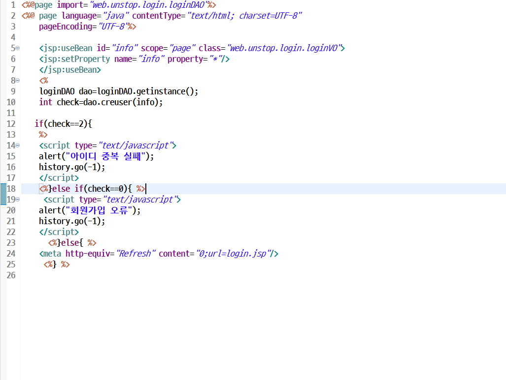 useBean을 이용해서 넘어오는 파라미터를 자동으로 VO에 담아서 info라는 변수에 저장했고 if문을 활용하여 반환값에 따른 다른 반응으로 유효성 검증을 할수 있도록 했습니다.