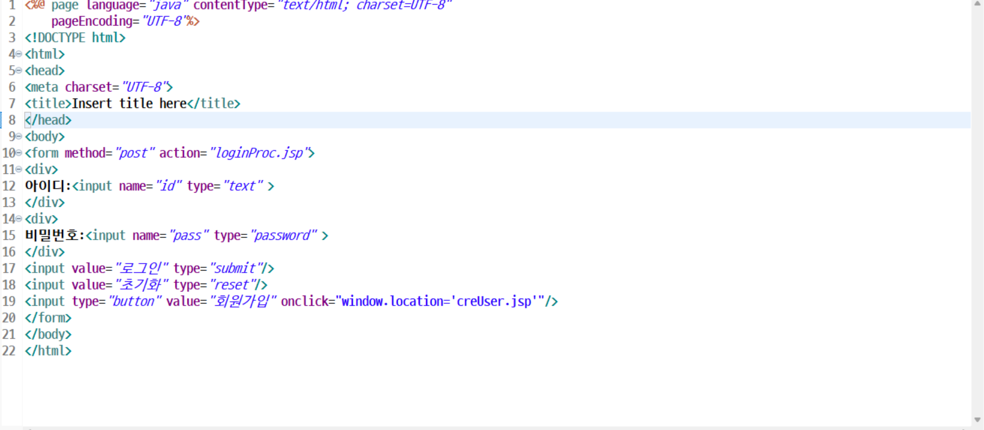 우선 로그인 페이지 jsp입니다. 저는 js를 이용해서 유효성 검사를 해주지 않았습니다. 만약 하고 싶으시다면 form에 name넣어서 사용하시면 가능합니다.