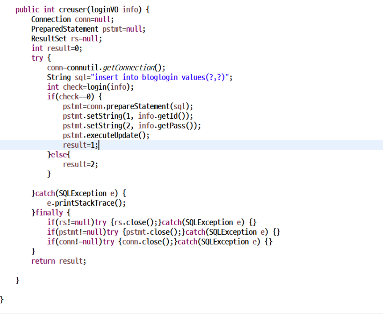 또한 DAO를 싱글톤으로 해서 사용할때마다 새로운 객체를 만들어서 갈비지컬렉션을 줄이도록 했습니다.