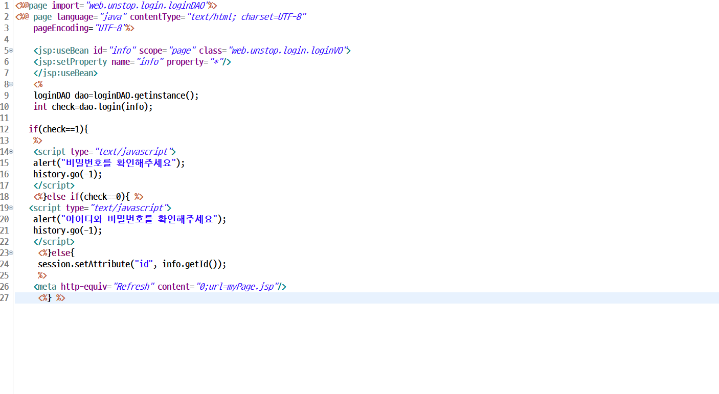 똑같이 useBean을 활요했고 비밀번호 틀렸을때 아이디가 틀려서 비밀번호를 체크하지 못했을때를 두가지 상황을 모두 알려주도록 했습니다. 또한 로그인하고는 세션에 id를 등록해서 로그인했는지 알수 있게 하였고 mypage로 이동하게 했습니다.