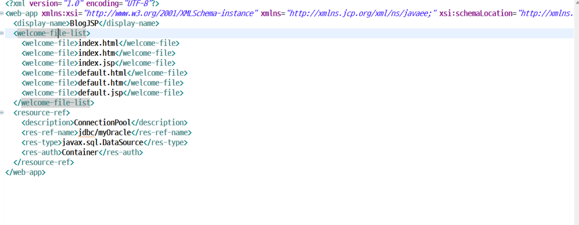 여기 서 resource-ref윗부분은 자동으로 생성 된것입니다. 여기서 description은 설명 name type auth를 참고해서 context.xml 에서 자원 즉 데이터를 찾아 옵니다.