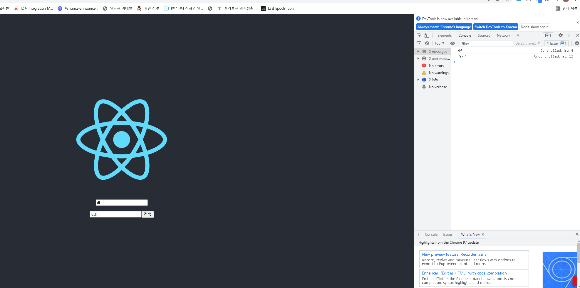 npm start 창을 켜서 새로고침하고 입력하고 전송 버튼 누르면 이렇게 잘되는걸 확인할수 있습니다.