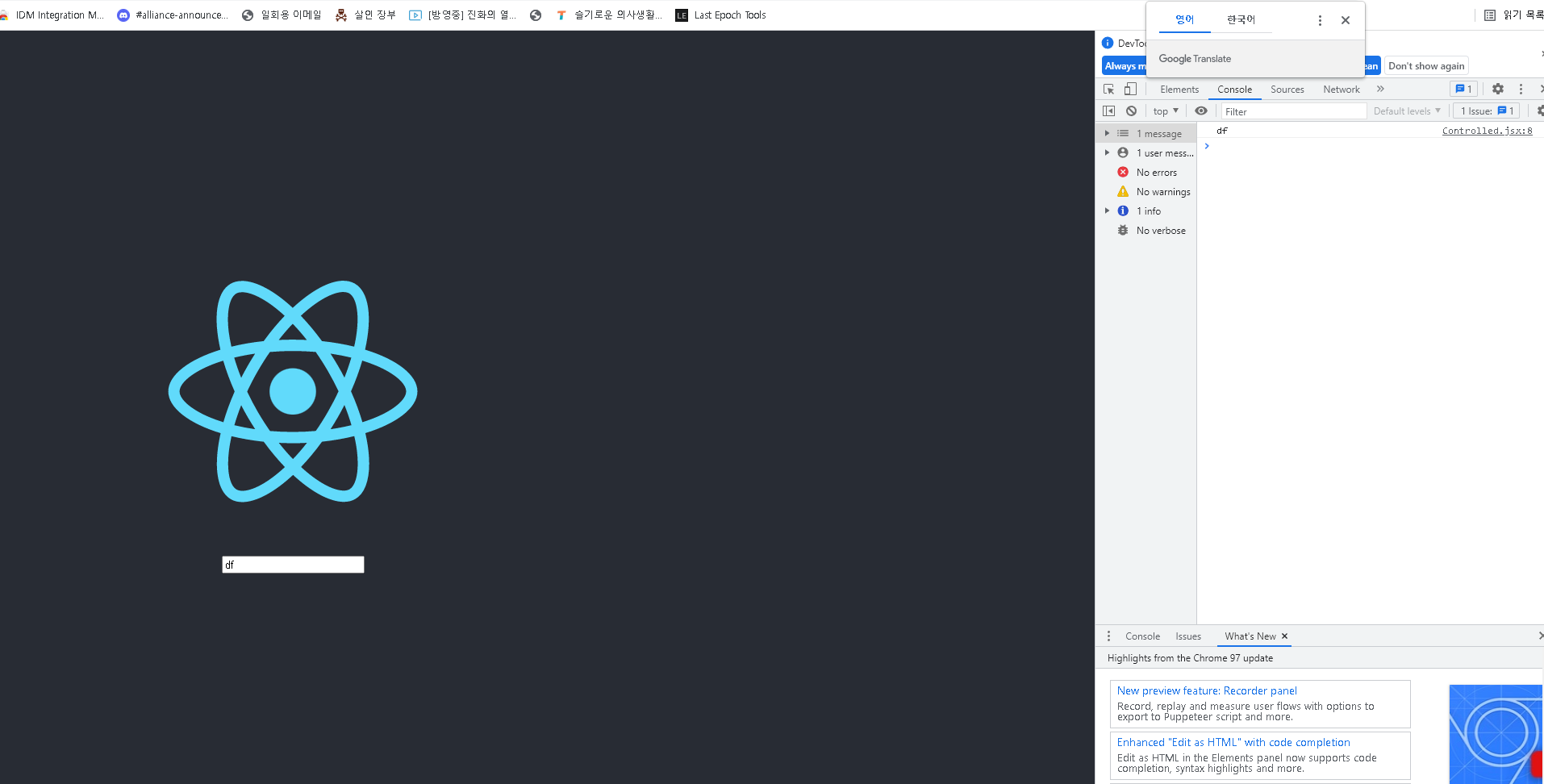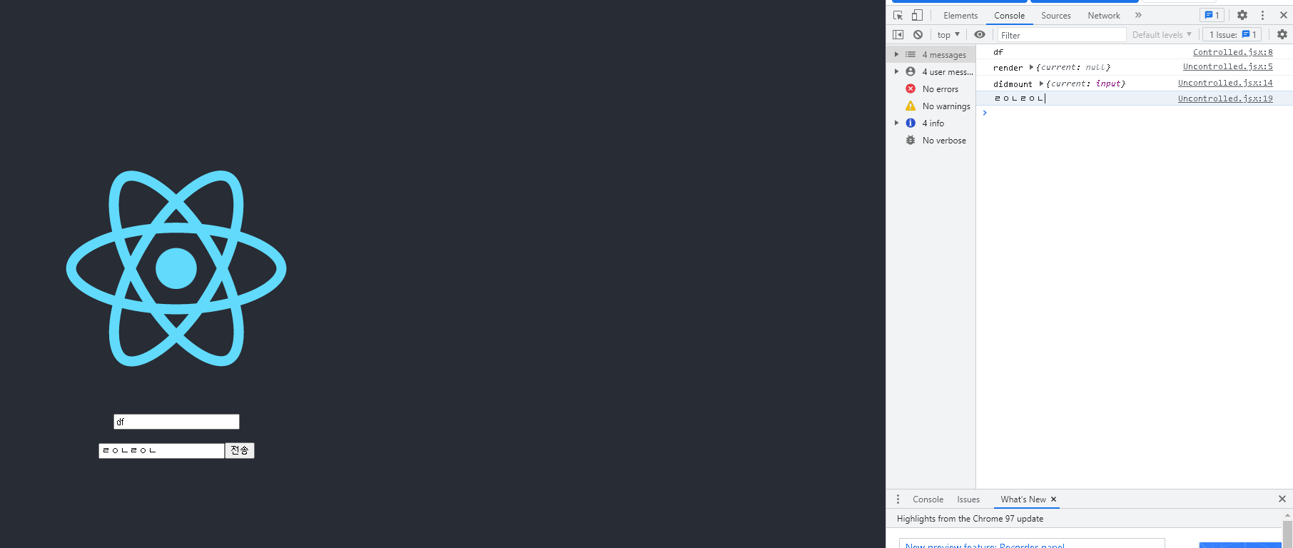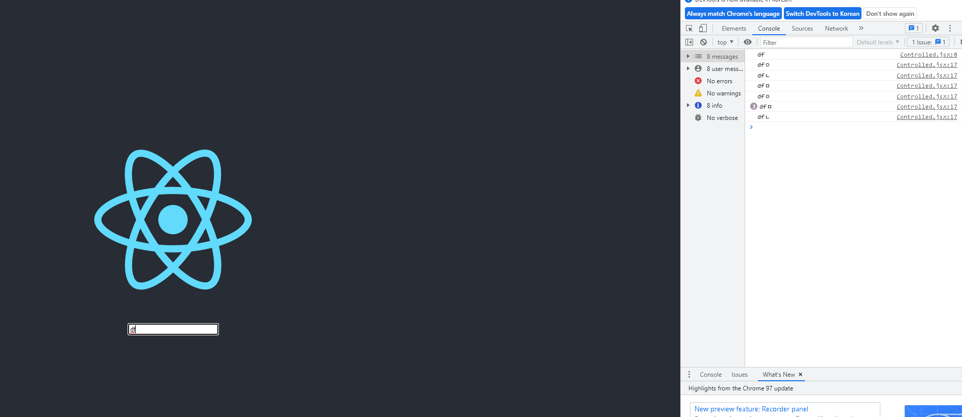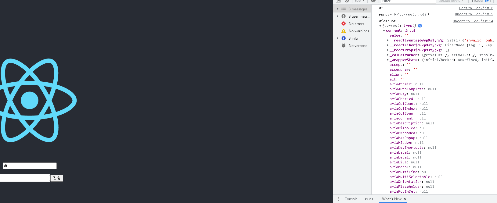 이렇게 df가 기본적으로 켜저있고 로그에 그 값이 나와있습니다. 이제 input창을 클릭하고 아무거나 쳐봅시다